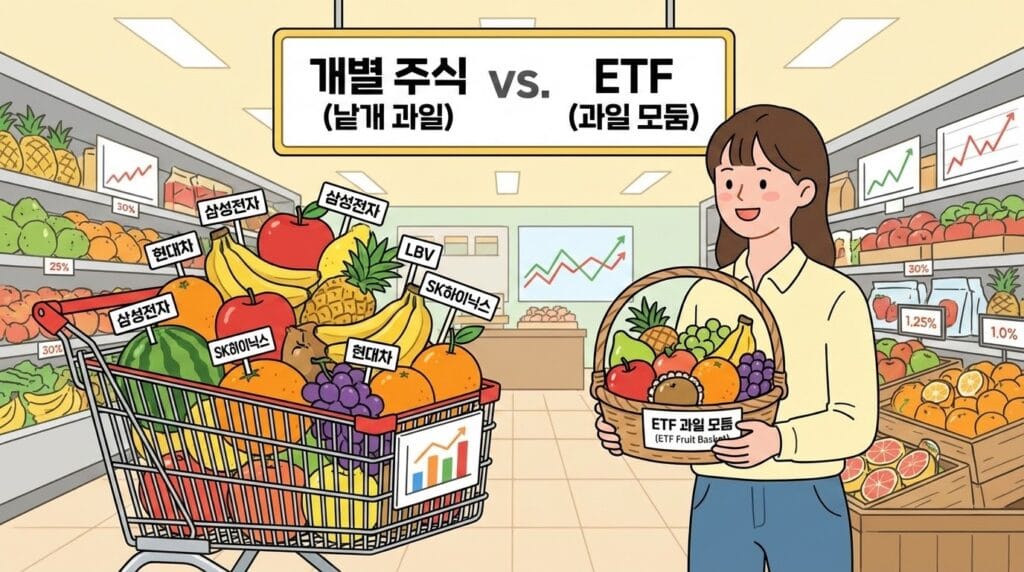💡 쉬운 비유: 마트에서 과일을 하나씩 고르는 게 “개별 주식 투자”라면, 과일 모둠 세트를 사는 게 “ETF 투자”입니다. 하나만 사도 여러 과일을 맛볼 수 있어요.