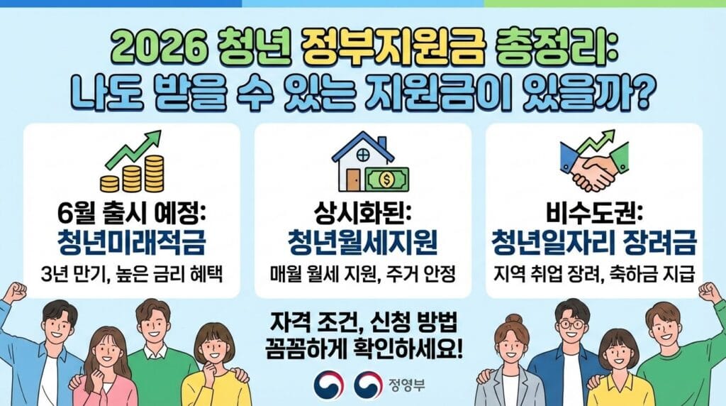 2026년에 청년이 받을 수 있는 정부지원금을 한눈에 정리했습니다. 6월 출시 예정인 청년미래적금, 상시화된 청년월세지원, 비수도권 청년일자리 장려금까지 자격 조건과 신청 방법을 꼼꼼하게 알려드립니다.